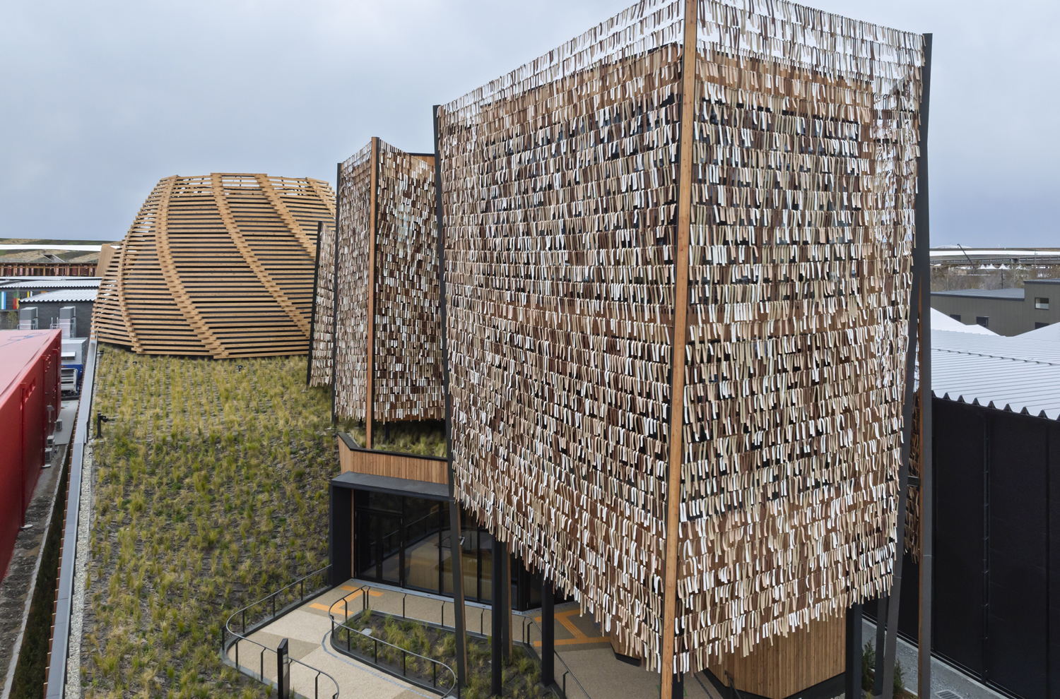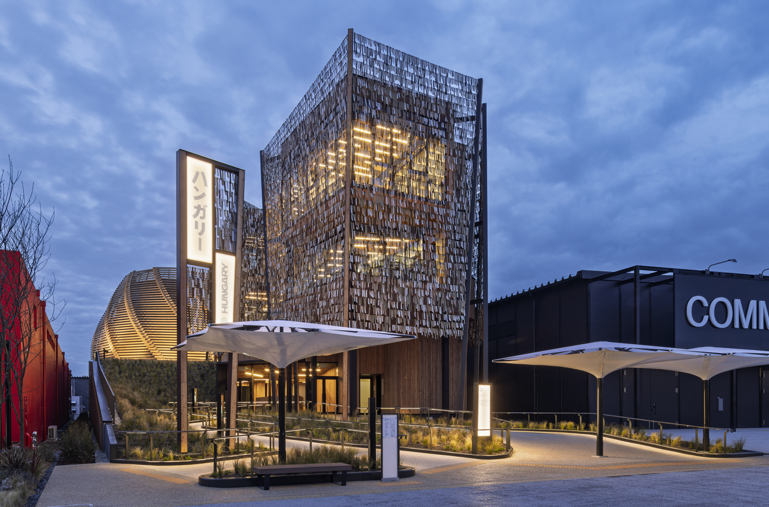 ハンガリーの草原を思わせる緑豊かな空間と、木の葉に見立てた短冊膜がひらひらと風に揺れ、神秘的な森を散策しているようにも感じさせる外観で、夜には更に幻想的に見えるパビリオンです。