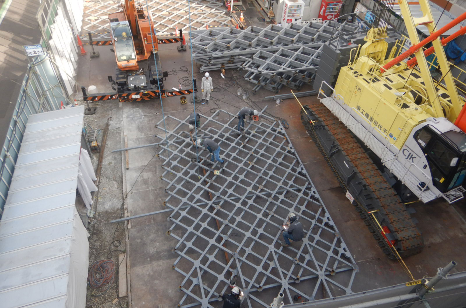 限られたスペースで施工が求められ、地組を必要とするDI式スペースネット工法としては手慣れた自社工法とはいえ難工事となりましたが、事故もなく無事に施工することが出来ました。