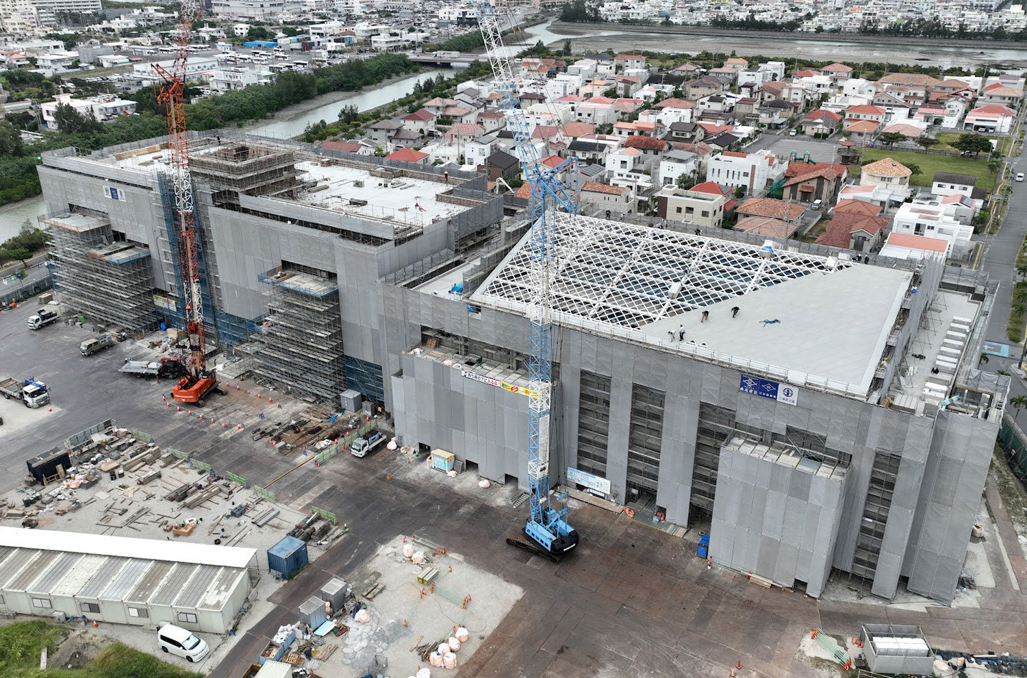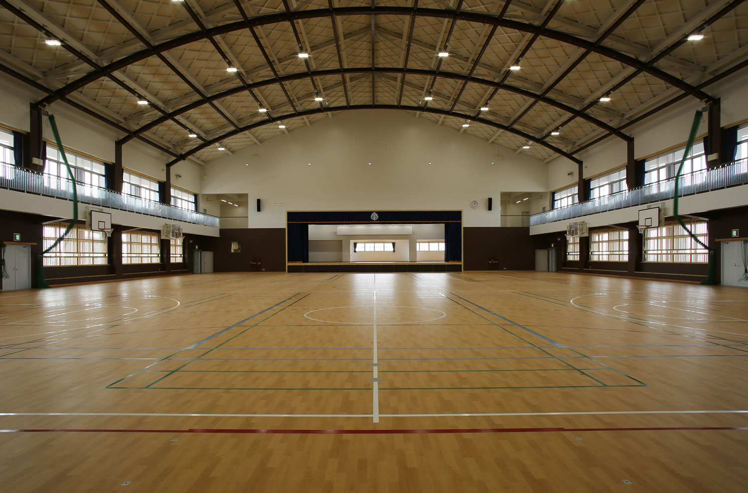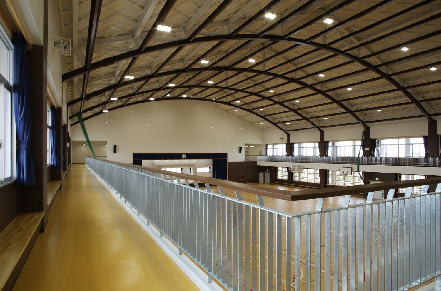 外観の屋根は山型の切妻屋根ですが、上弦材に格子母屋、下限材は茶色に塗装された鉄骨がアーチ状に施工されています。