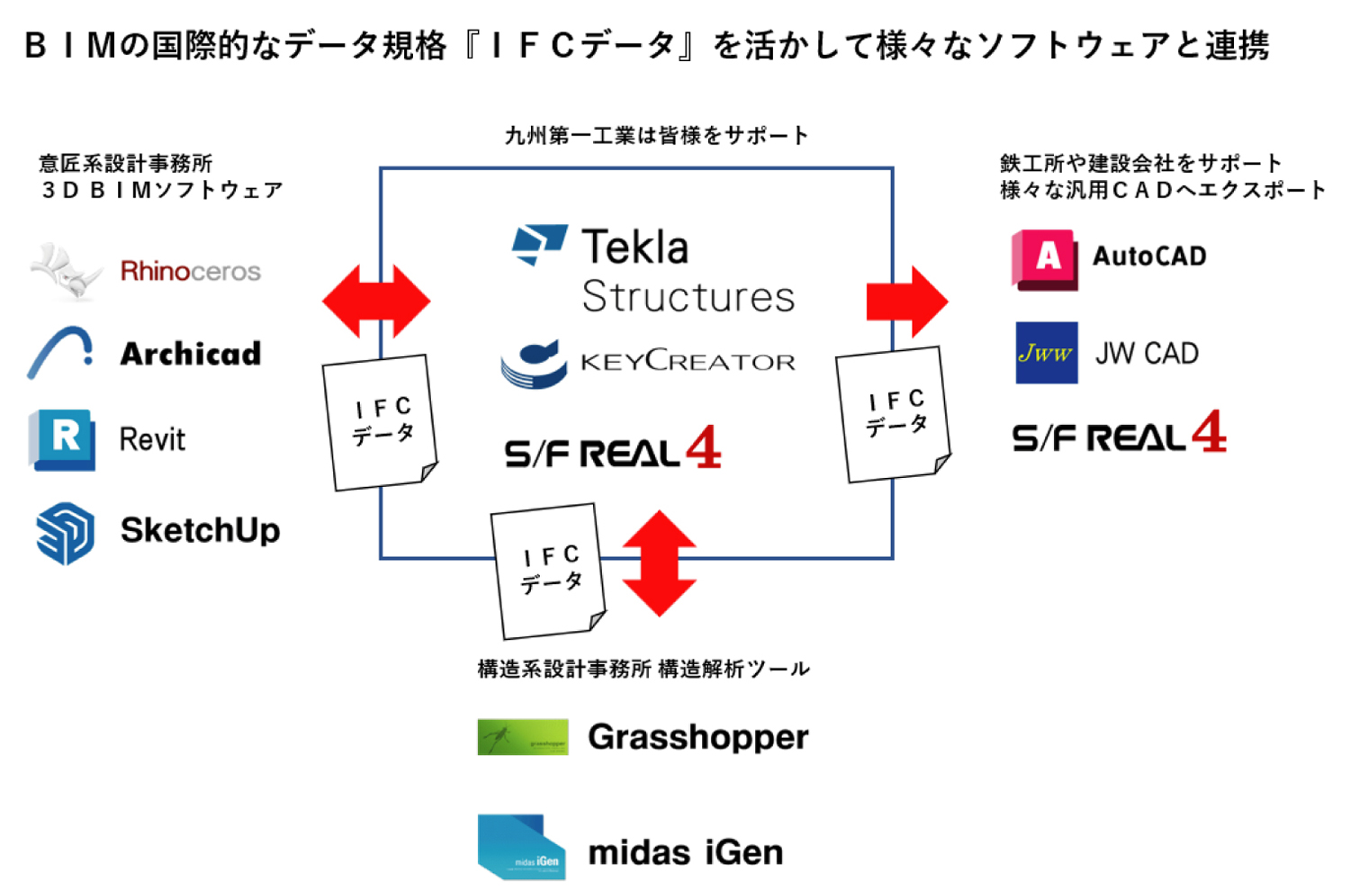 弊社では、BIMの使い方が物づくり目線と言う事で、メインとして「Tekla Structures(テクラ ソトラクチャー)」を使用していますが、 お客様とのデータのやり取りはBIMの国際的なデータ規格『IFCデータ』を使用しますので、様々なソフトウェア との連携が可能です。IFCデータに対応しているソフトウェアをお持ちであれば、ご対応可能です。