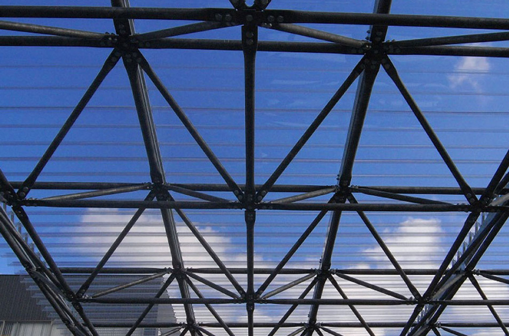従来のボールジョイント立体トラスとは一線を画すボルトジョイントを採用し、低価格、軽量、短納期を実現した新工法。