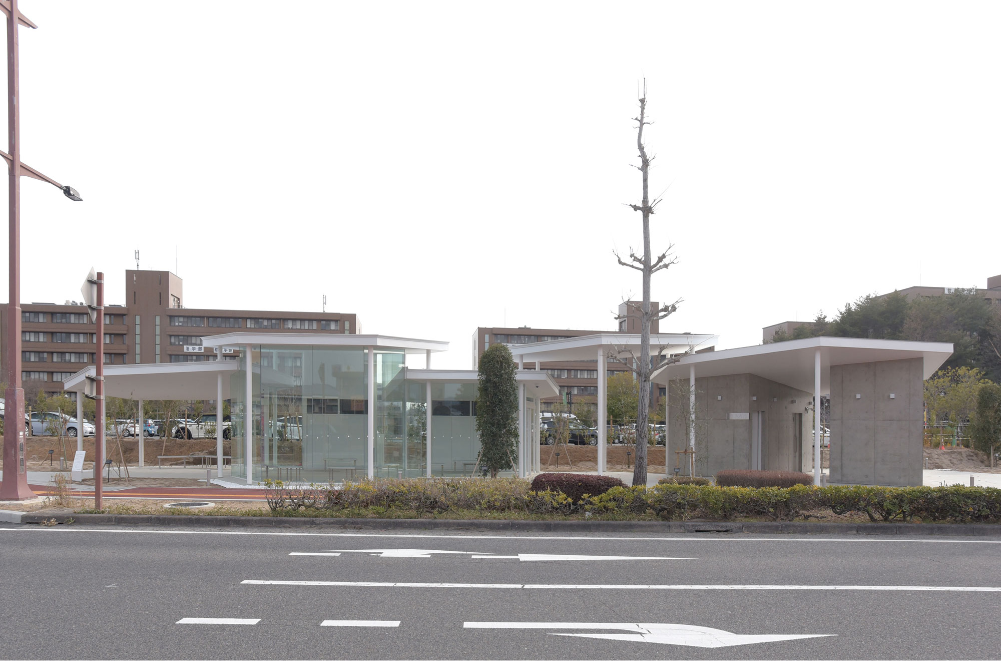 広島大学中央口で、大通りと駐車場の間にアクセントを感じますね。