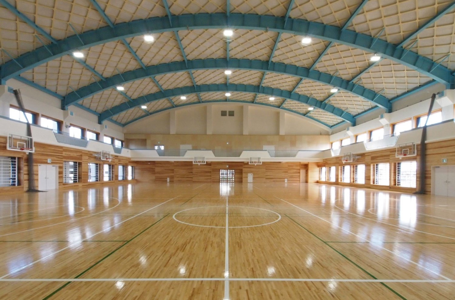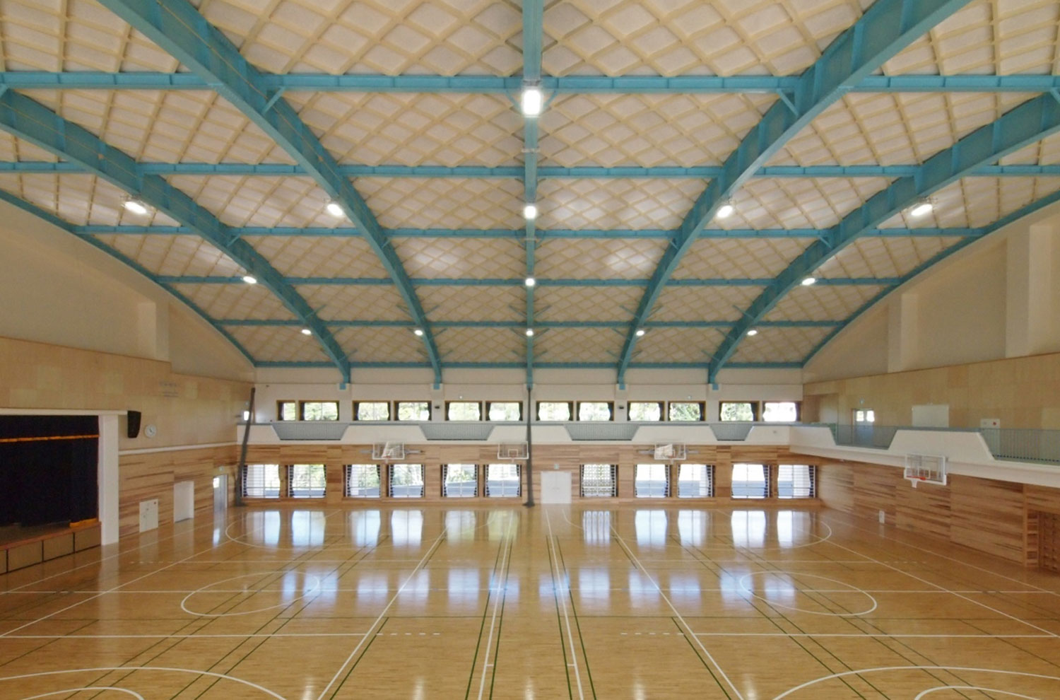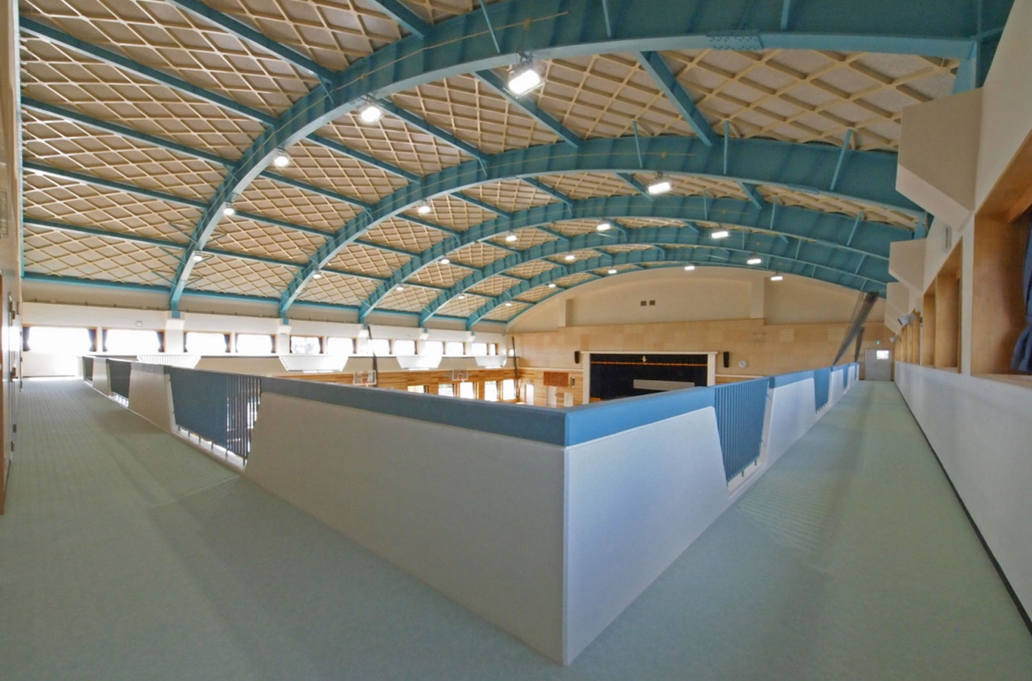 今回の斜め格子母屋、形状はアーチ型、ライトブルーの鉄骨にベージュの格子母屋で仕上てあり、沖縄の海と青空を連想させる美しい仕上がりです。