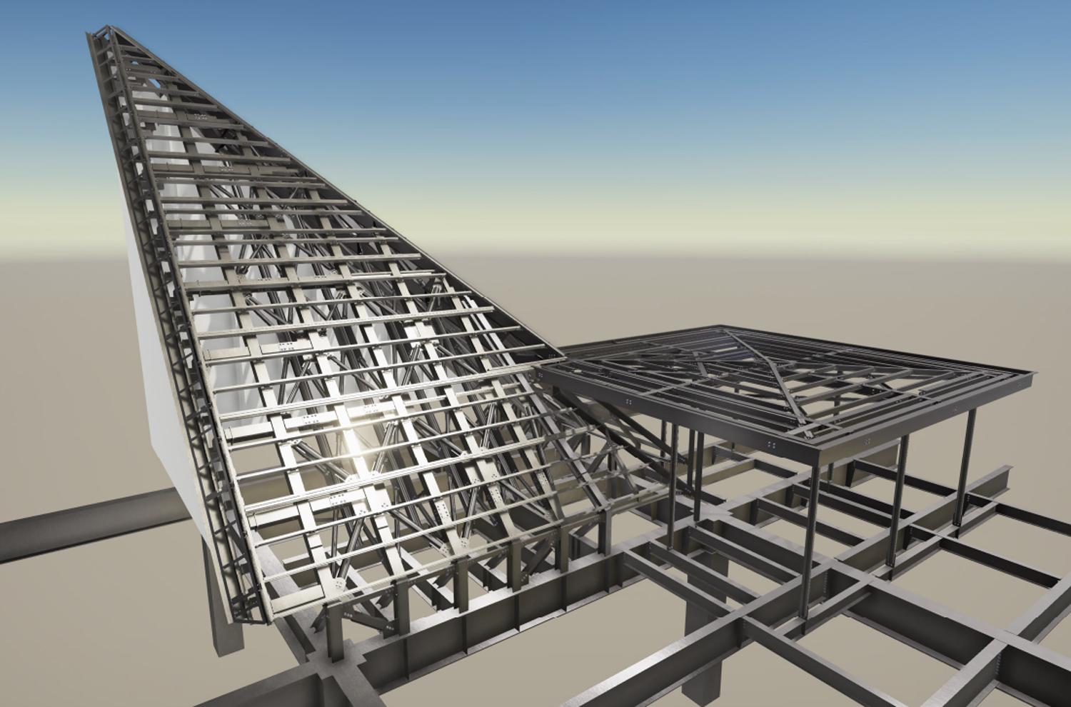 アミュプラザくまもと8階に誕生した「ザ・フォレストテラス熊本」のチャペル「スカイ・アーク」の鉄骨工事をさせて頂きました。『天空で行う挙式 ノアの方舟をイメージした「スカイ・アーク」』と意匠性を重視したチャペルとあって、前方はガラス貼りで柱は立てない、屋根は可能な限り薄くしてほしいと、設計からの要望も強く、鉄骨部材数も非常に多い難工事となりましたが、弊社のBIMの技術を最大限に活かし、成し遂げる事が出来ました。