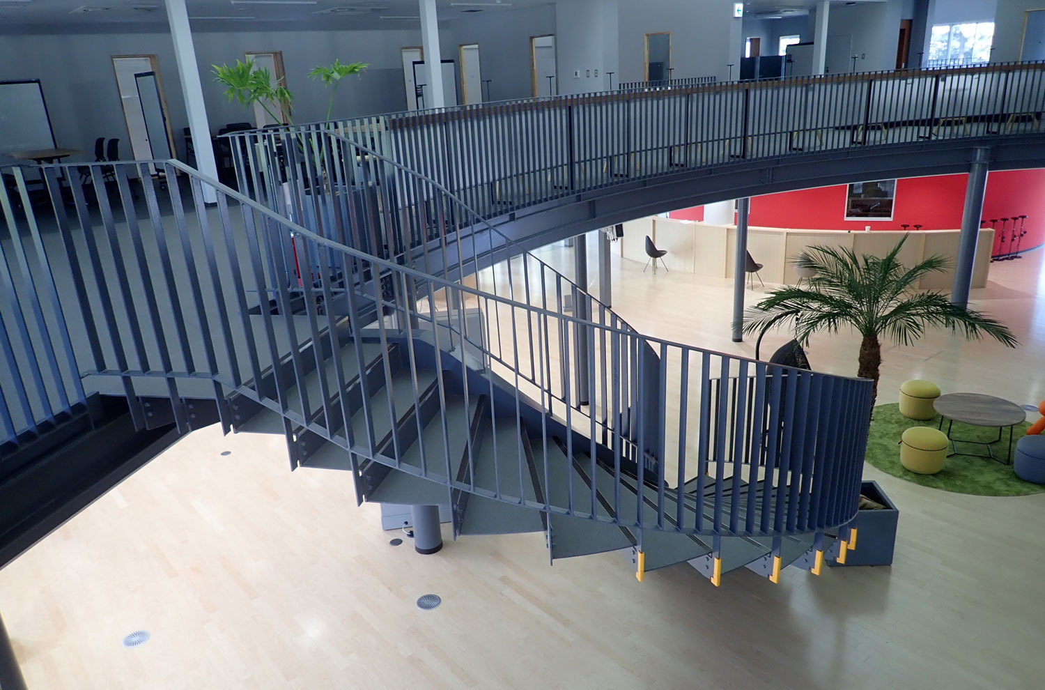 令和4年5月26日 九州工業大学の新施設『GYMLABO(ジムラボ)』がオープン!オープンスペースに設置された螺旋階段を施工させて頂きました。