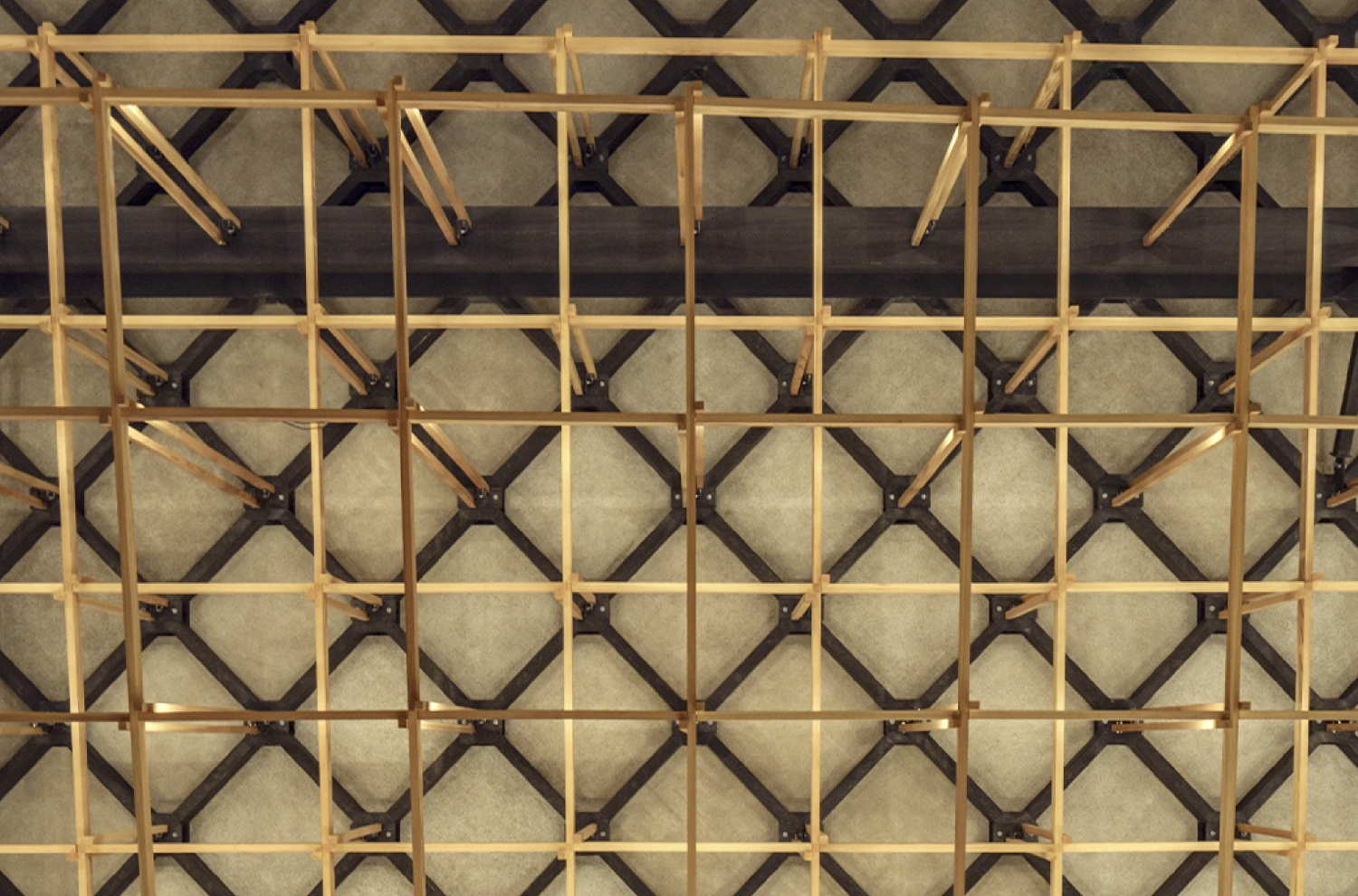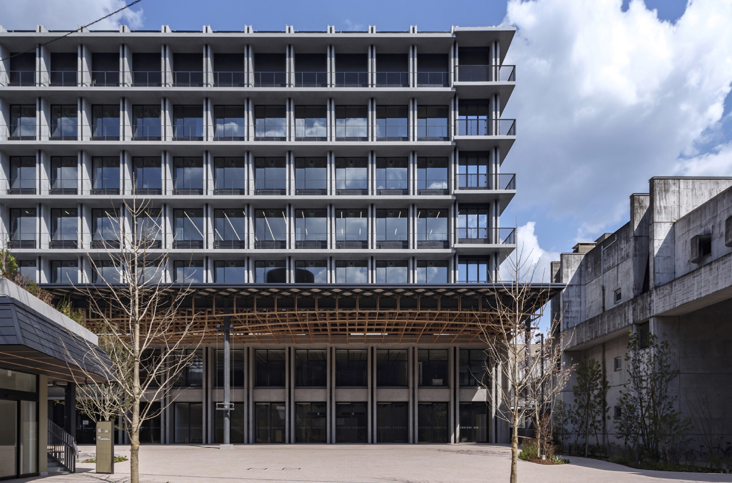 軒先の屋根に斜め格子母屋が設置され、自然の温かさを感じさせる木のルーバーを支えています。
