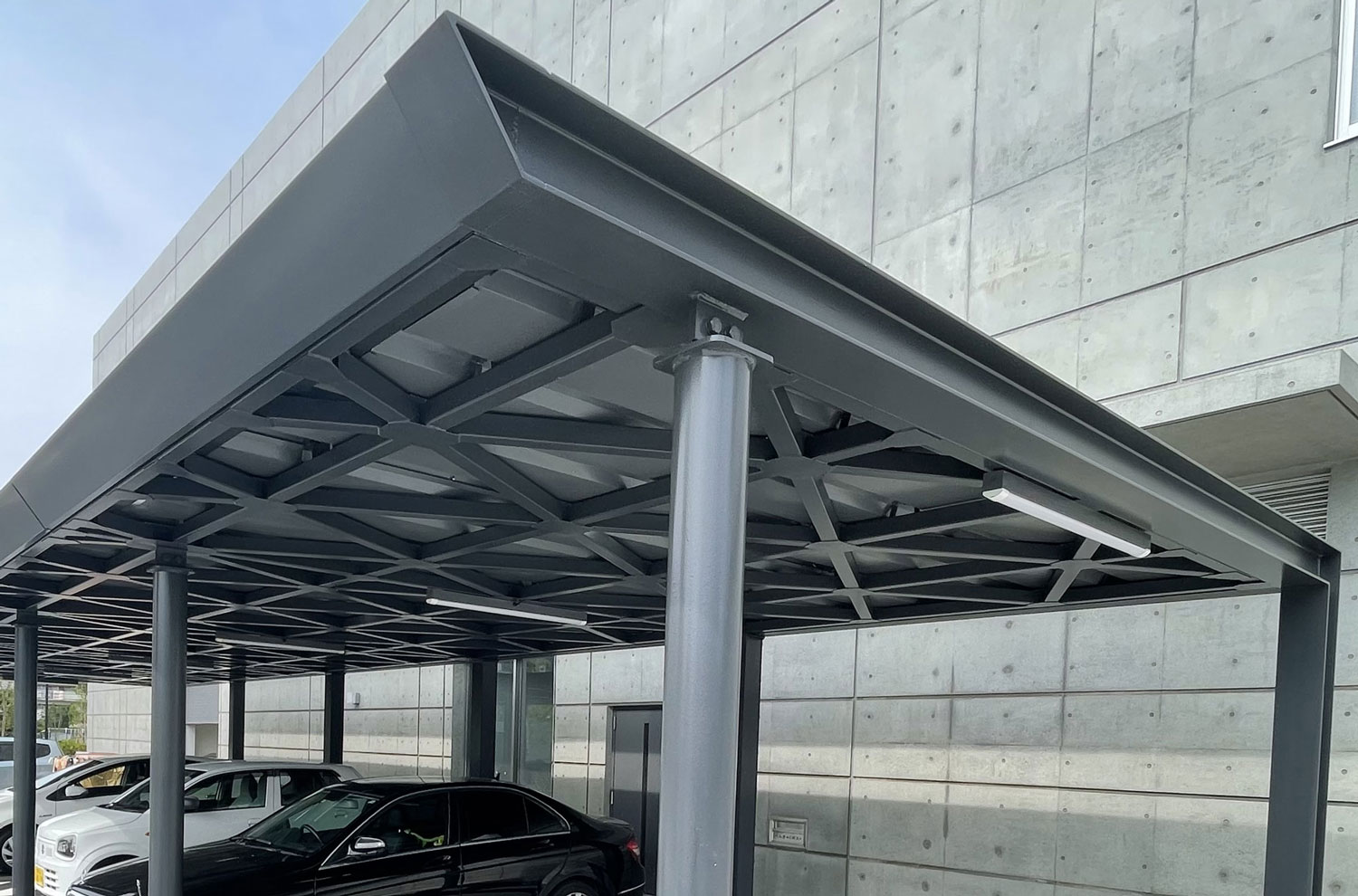 外観もとても立派な仕上がりとなっており、弊社の担当した駐車場屋根は施設の裏手になりますが、存在感を感じる駐車場屋根に仕上がっています!